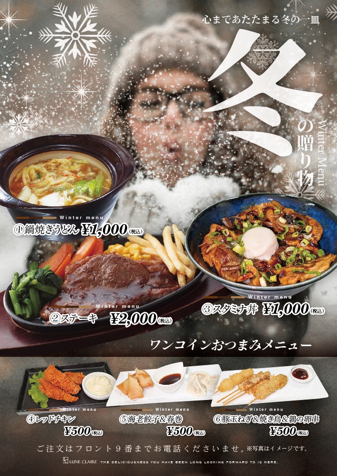2026/01/29 キャンペーン 冬の贈り物「ウィンターメニュー」 ウィンターメニューのご案内です 鍋焼きうどんやステーキ、 スタミナ丼など心まであたたまる冬の一皿をご用意しております◎ ぜひご賞味ください Tweet 次の記事 前の記事 記事一覧へ