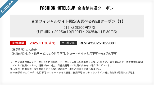 2025/10/29 クーポン 【オフィシャルサイト限定】選べるWEBクーポン ・ウォークイン限定クーポンです ・WEB予約をご利用の際はクーポンのご使用はできません 【1】休憩300円割引 【2】宿泊500円割引 【3】宿泊限定 前延長または後延長60分無料サービス Tweet 次の記事 前の記事 記事一覧へ